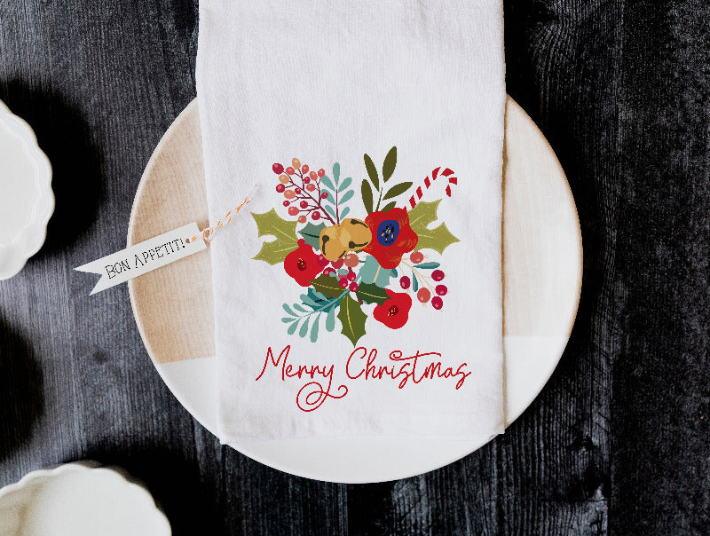 Christmas Bells Floral Tea Towel | Personalized Festive Kitchen Gift