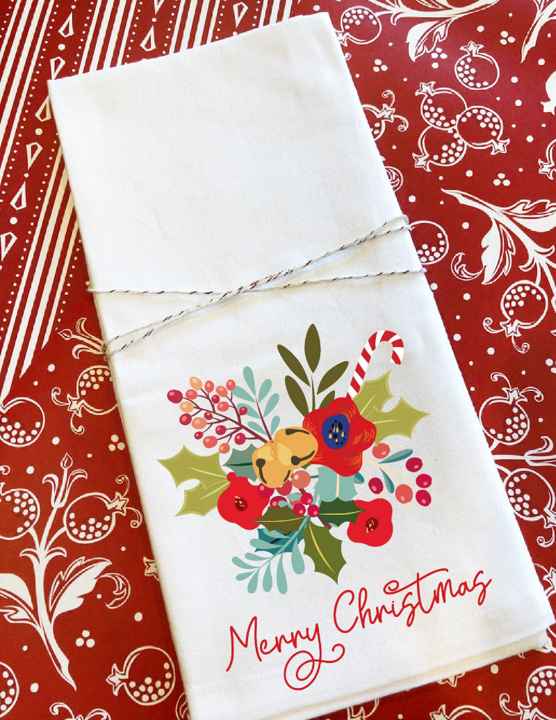 Christmas Bells Floral Tea Towel | Personalized Festive Kitchen Gift - Single is backordered and will ship as soon as it is back in stock.