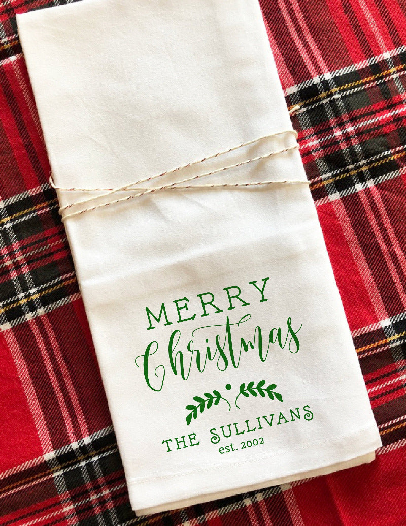 Green Laurel Custom Holiday Tea Towel | Personalized Festive Kitchen - Single is backordered and will ship as soon as it is back in stock.