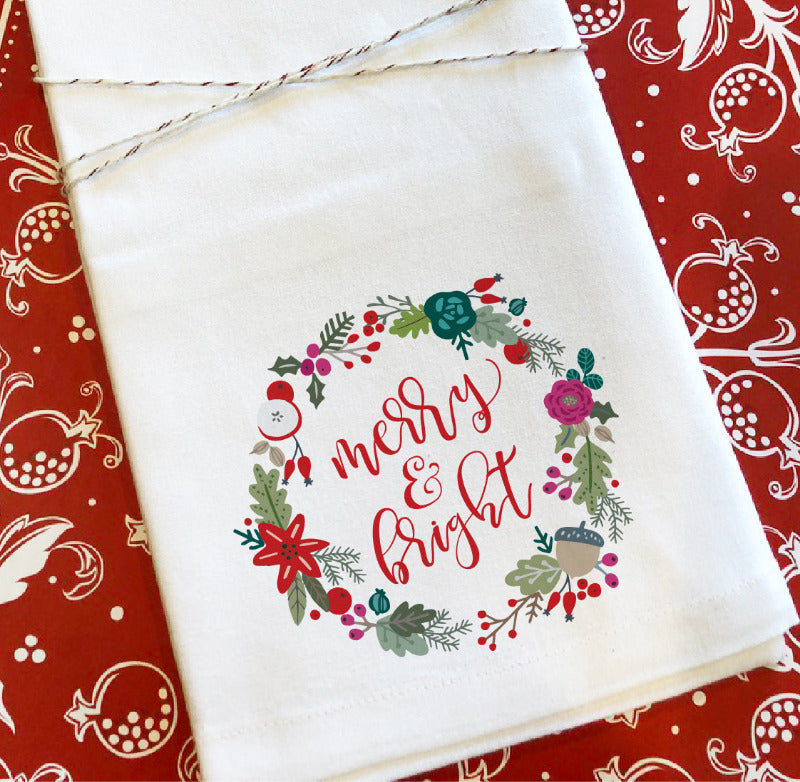 Merry & Bright Wreath Tea Towel | Personalized Festive Kitchen Gift - Single is backordered and will ship as soon as it is back in stock.