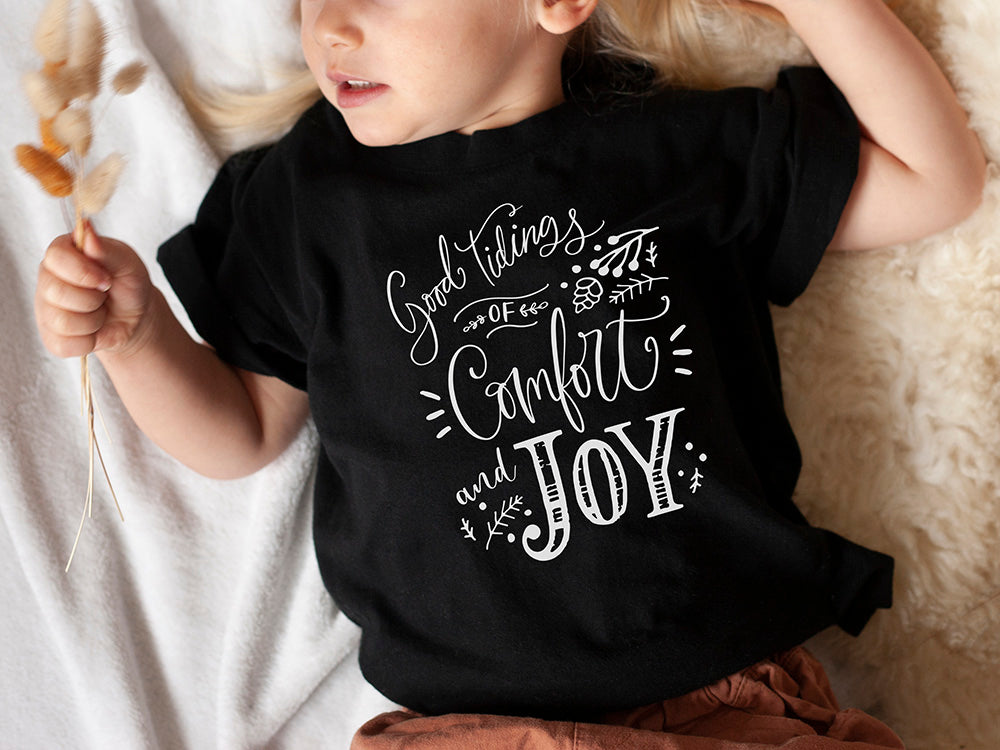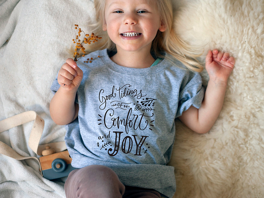 Child wearing a shirt with 'Good tidings of Comfort and Joy' text, lying on a soft surface.