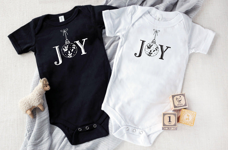 Fill the season with pure joy in our JOY Christmas Baby Bodysuit. Personalized with your baby's name and available in multiple sizes, this sweet and cheerful bodysuit is printed and shipped directly to your door — a delightful and heartfelt gift for baby's first Christmas, holiday family photos, baby showers, or any joyful celebration welcoming a precious new arrival.