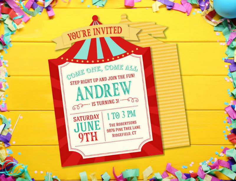 The Circus Theme Die Cut Invitation is a spectacular, big-top way to welcome every guest to your little one's birthday extravaganza — a bold, colorful circus design bursting with acrobats, clowns, bright stripes, and all the dazzling showmanship of the most magical circus in town.