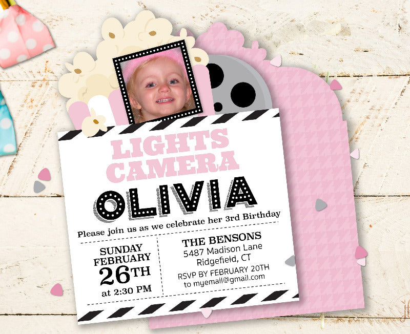 Pink Movie Night Die Cut Invitation | Custom Kids Birthday Party Invite