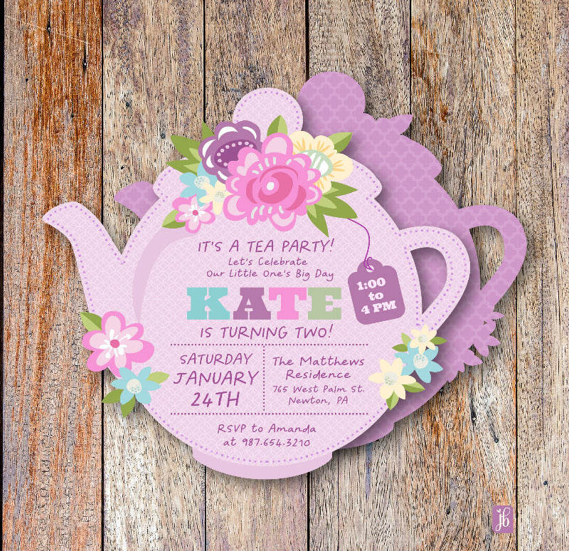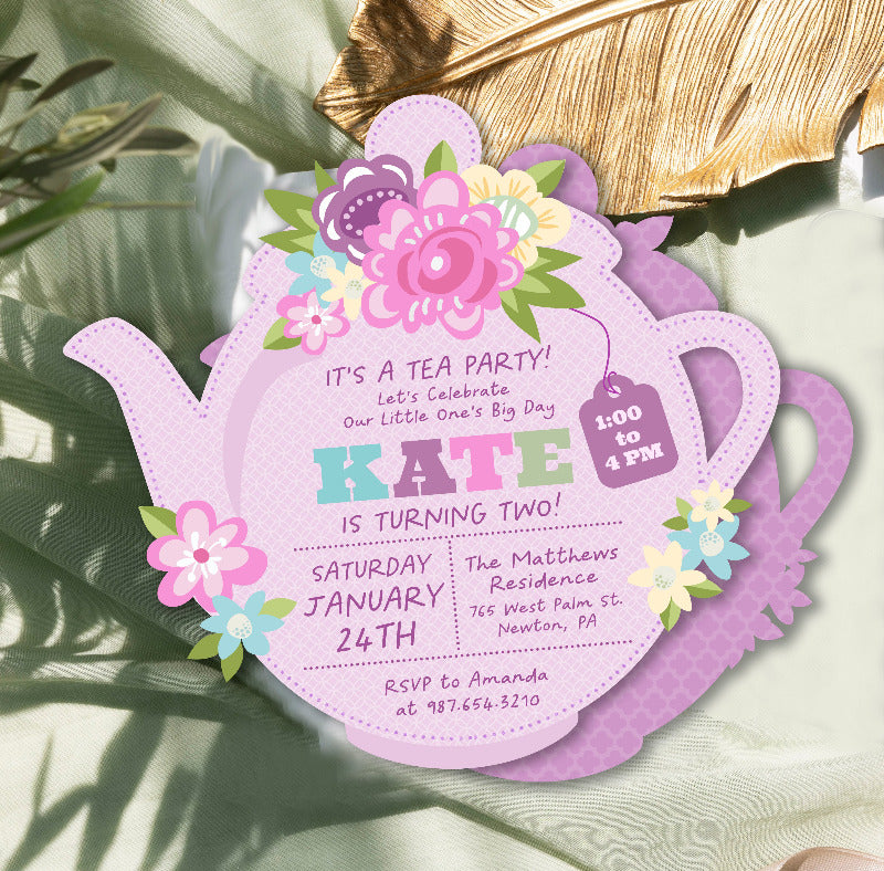 Tea party birthday invitation shaped like a teapot with floral decorations on a leaf background.