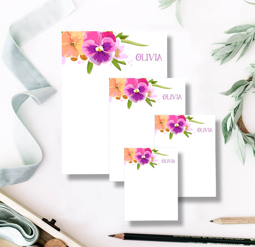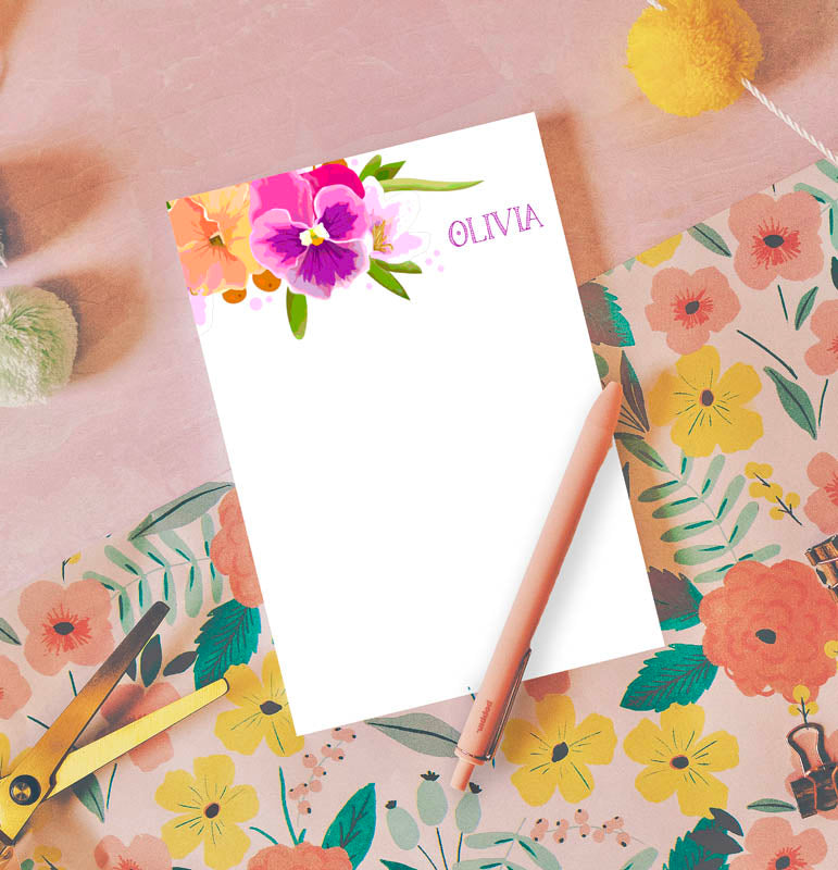 This personalized Pink Pansy Bouquet Notepad is the perfect way to stay organized and take notes in style. With customization available, you can make the notepad one of a kind. The soft colors of the bouquet make it perfect for any home or office desk.