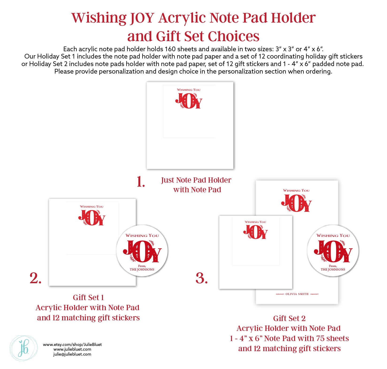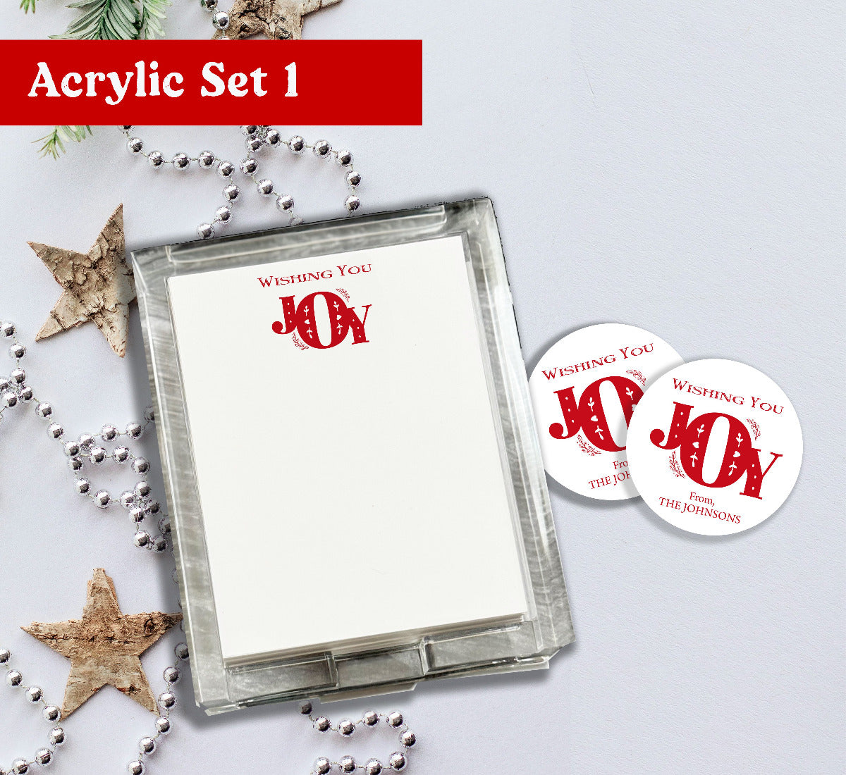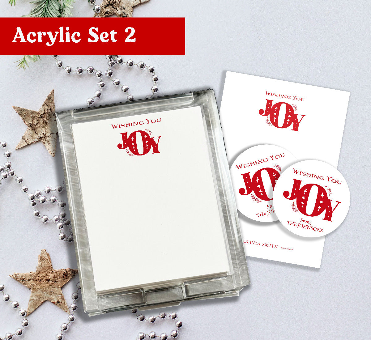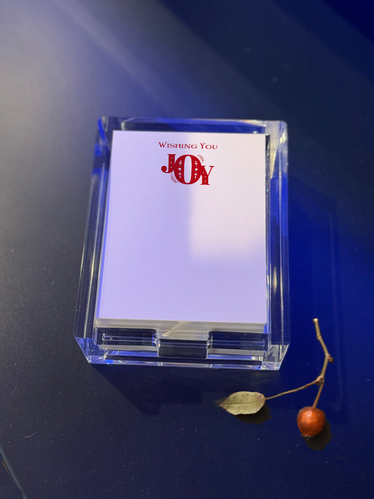 Elevate your gift-giving with the Wishing JOY Acrylic Notepad Holder. This sleek, transparent organizer keeps notes within easy reach while adding a festive touch to any desk. Its durable acrylic construction ensures longevity, making it a thoughtful and practical present for colleagues, friends, or family during the holiday season. Perfect for staying organized with a touch of seasonal cheer. We also offer two gift set variations.