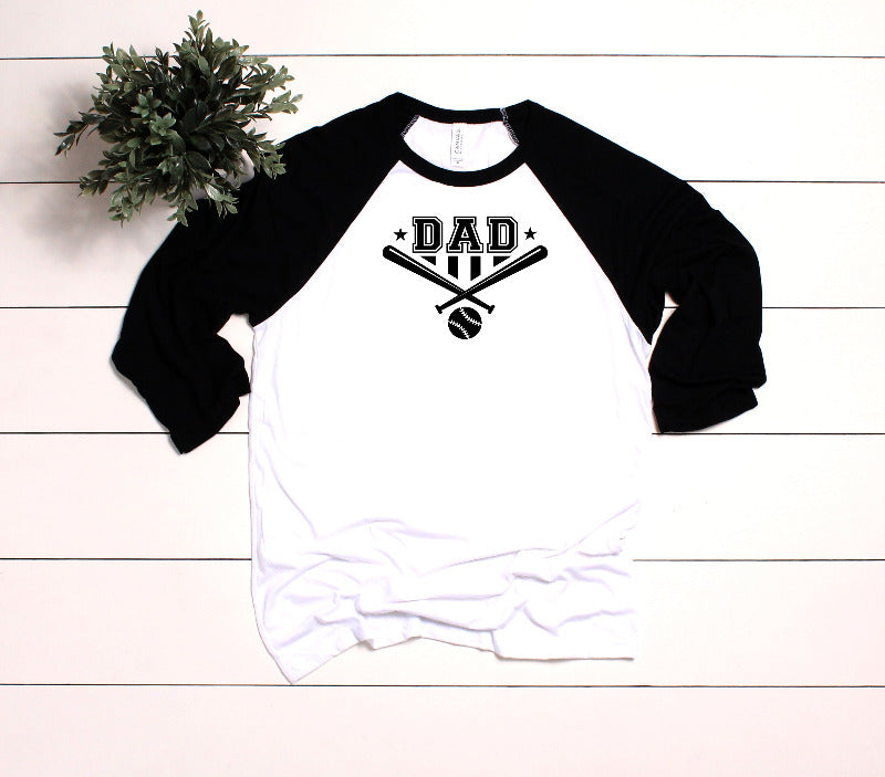 A black and white baseball dad raglan t-shirt with three-quarter length sleeves, a crew neck, and contrast trim. The shirt features a graphic that says 'DAD' with baseball bat and ball images.