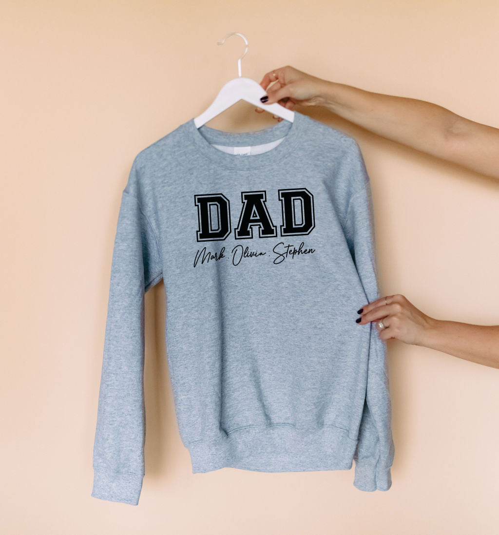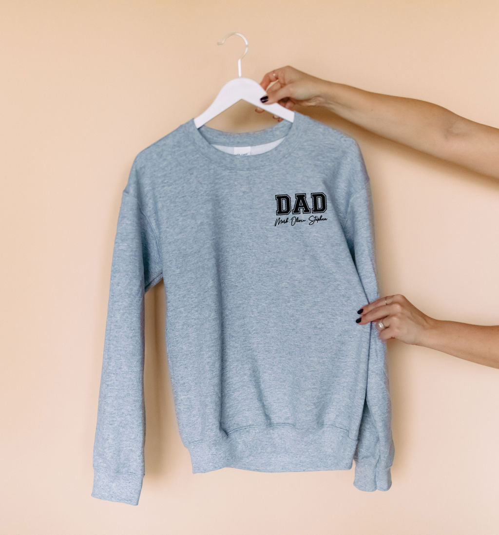 Keep him warm in a sweatshirt made just for him with this personalized Dad and Kids Names sweatshirt! Simply tell us the names of his children and we'll create a custom piece that celebrates the ones who made him a dad. Featuring a clean minimalist design, this sweatshirt is soft, comfortable, and deeply personal everyday wear he'll reach for again and again. A heartfelt gift for Father's Day, birthdays, Christmas, or any occasion that calls for something truly one of a kind. Relaxed fit designed for all-day warmth and comfort.
