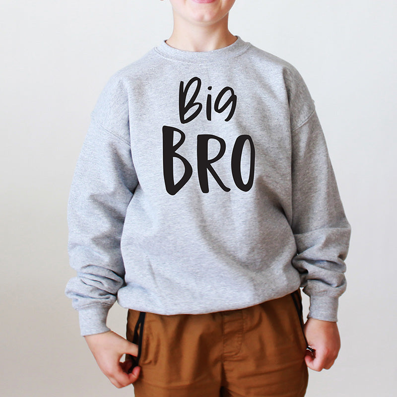 Boy wearing a gray sweatshirt with 'Big Bro' text on a plain background