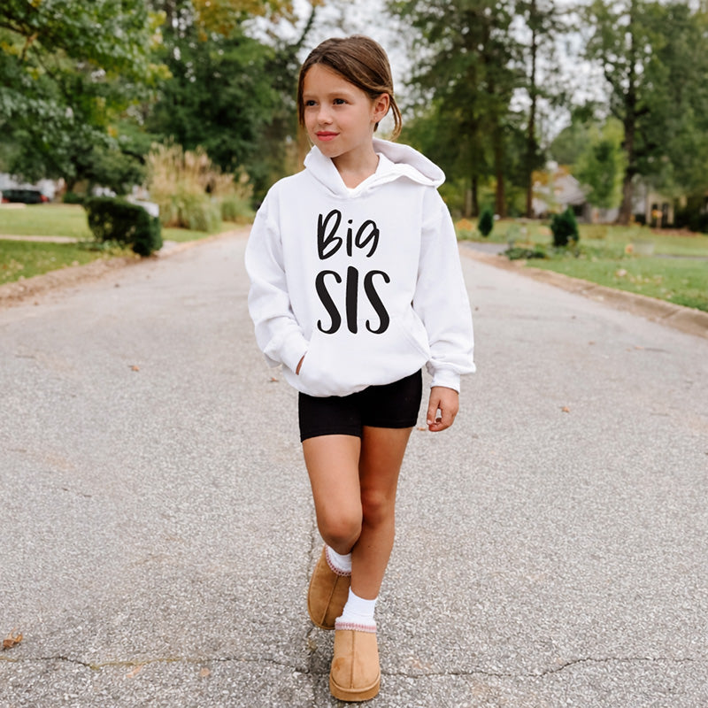 Child wearing a white hoodie with 'Big Sis' text, walking on a road.