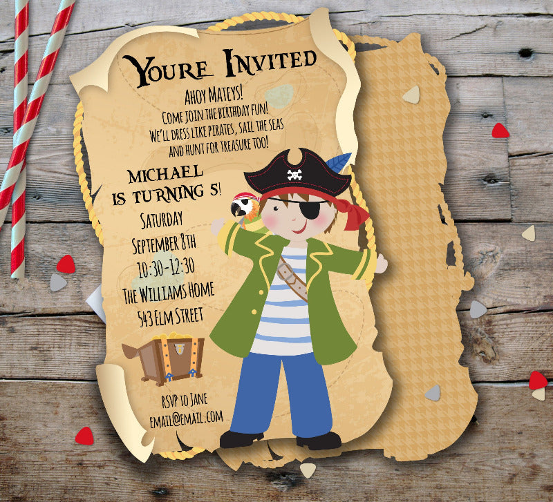 Printed on premium quality cardstock and fully customized with all your party details, this invite is pure pirate gold.