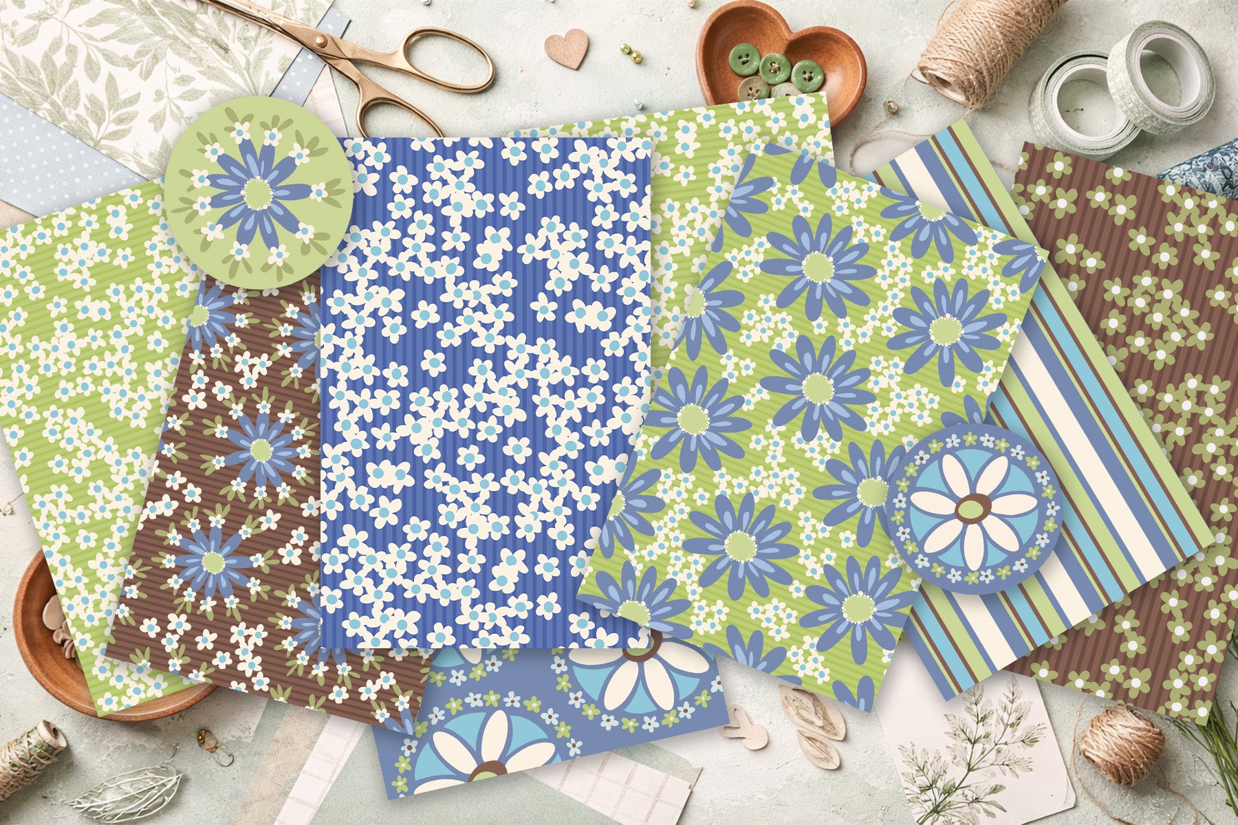 Collection of floral-patterned paper sheets on a wooden surface with scissors and other materials.