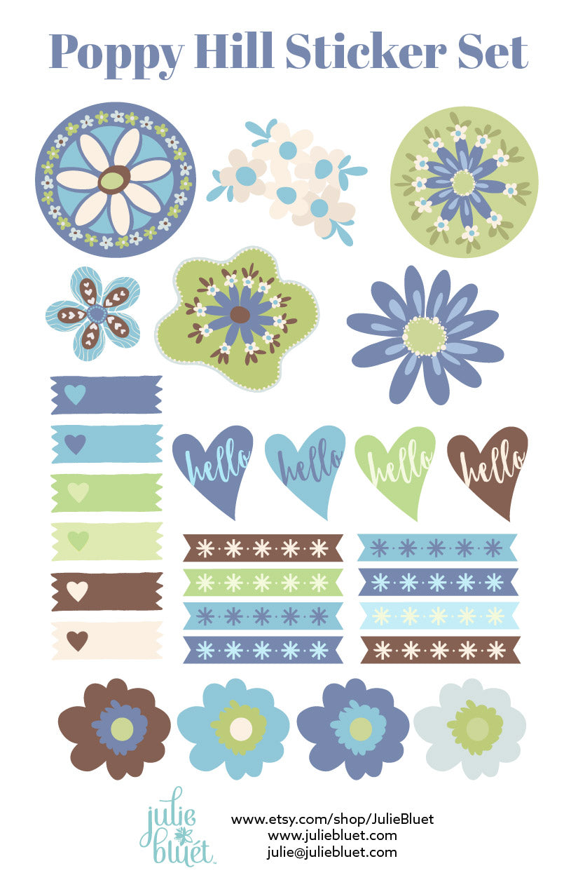 Poppy Hill Sticker Set with flowers and 'hello' text on a white background