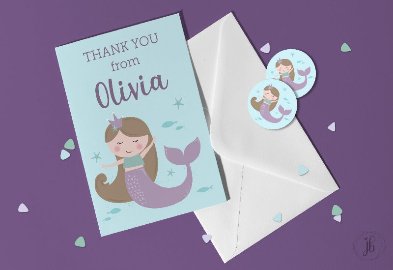 Make your ocean celebration extra magical with this Mermaid Party Personalized Under the Sea Thank You Card Set. These custom mermaid thank you cards feature a whimsical under the sea design and are personalized with your child’s name or short message, printed on premium card stock with plenty of room to write. Perfect for mermaid birthday parties, pool parties, beach parties, sleepovers, and ocean-themed celebrations, this under the sea thank you card set adds a fun, colorful finishing touch to your party and makes adorable keepsake notes for guests.