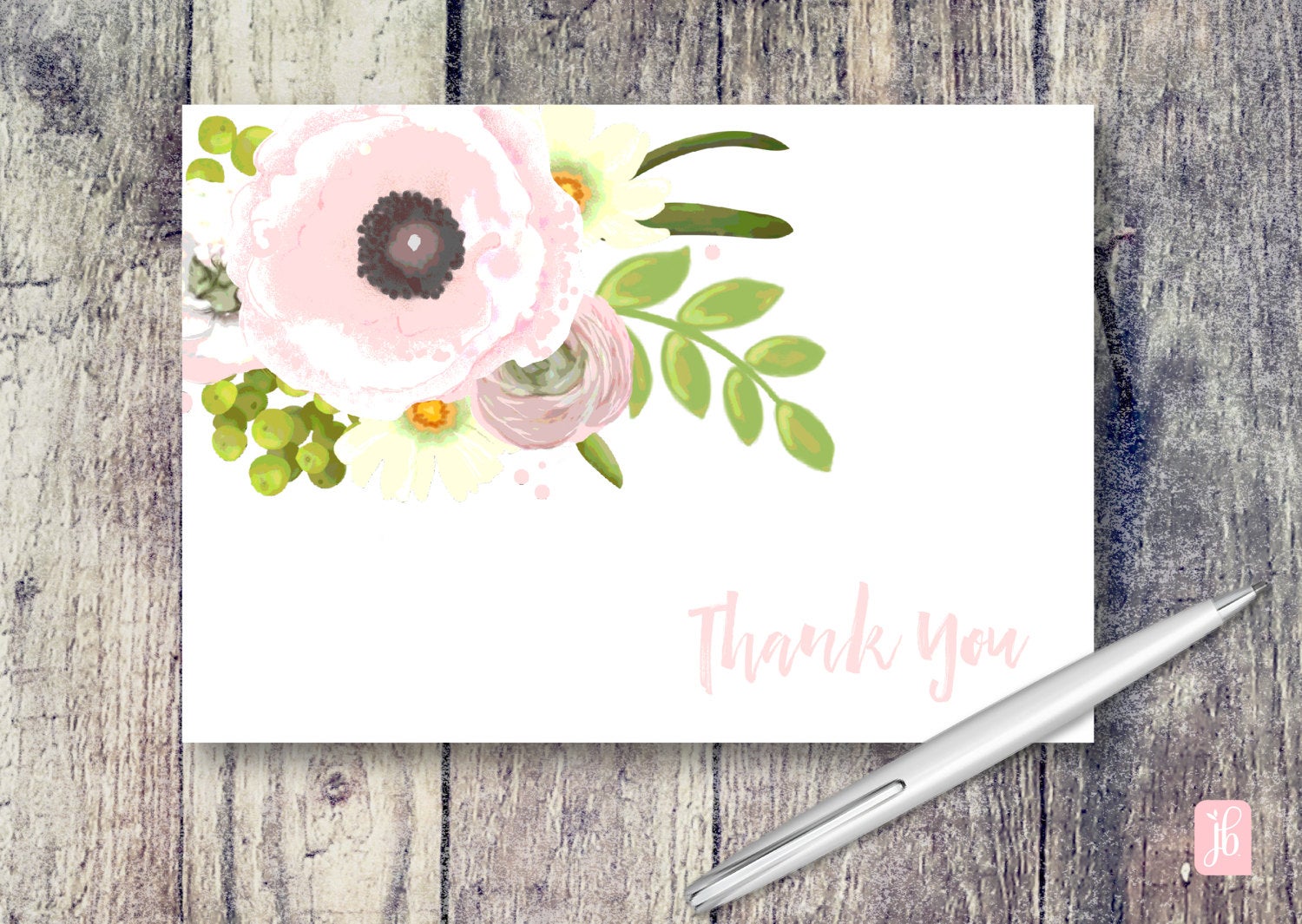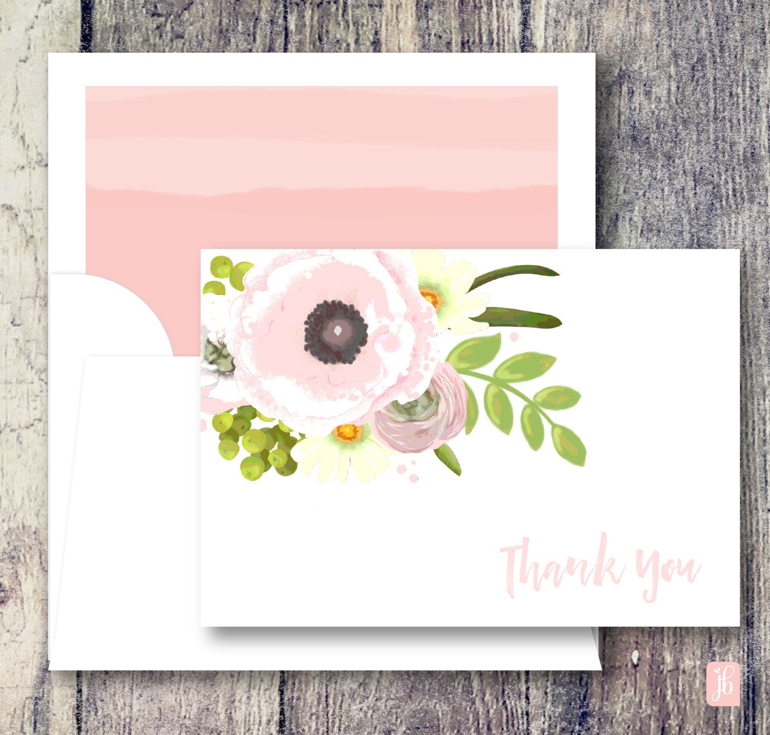 A set of two thank you cards with a pink floral design on the front, placed on a wooden surface.