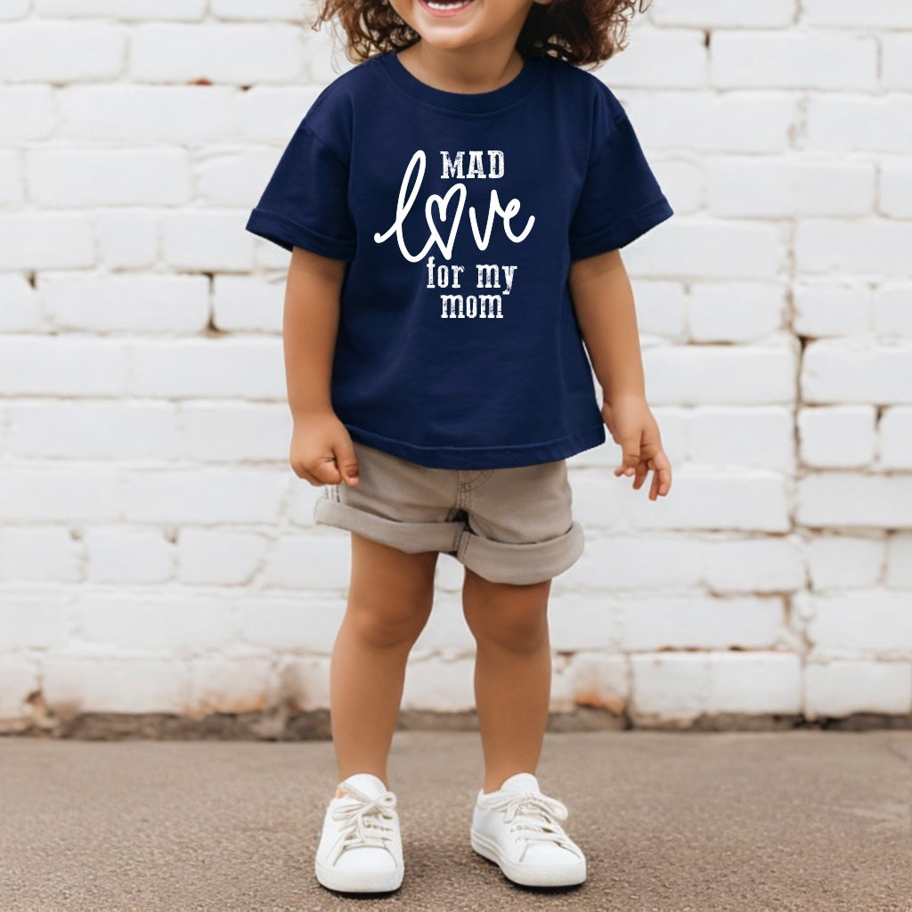 Child wearing a navy blue t-shirt with 'Mad love for my mom' text, standing against a white brick wall.