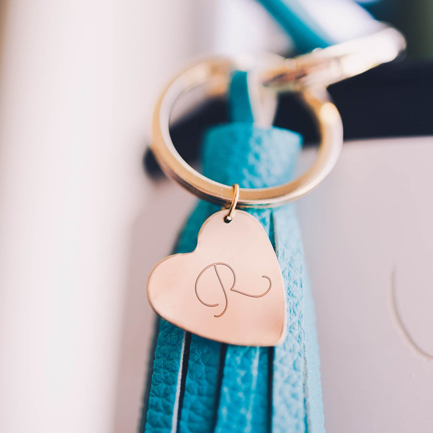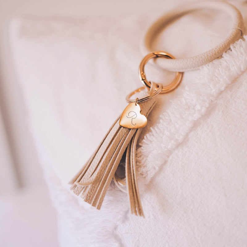 A blue faux leather tassel keychain with a personalized gold-filled heart-shaped pendant engraved with a single letter.